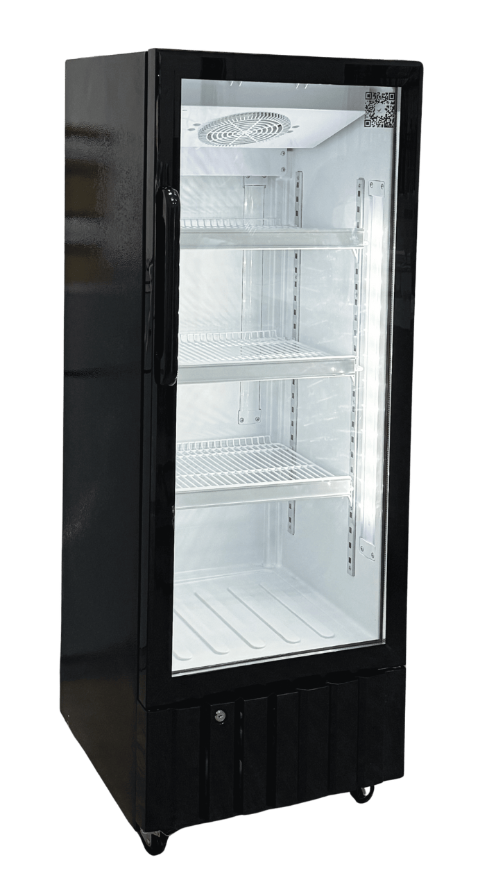 | No frost fan cooling system, upper and lower fans, operation temperature 0~10°C, 3 shelves. Double layer glass door. WITHOUT light Box. |